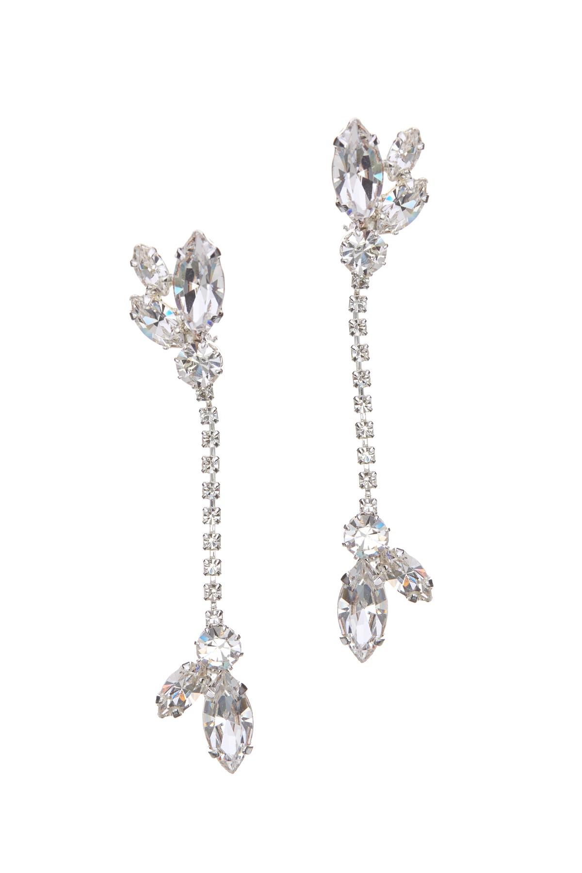 Long drop rhinestone earrings featuring navette details. The stones are in a classic clear crystal shade. The metal components are silver plated with extended durability. The ear post is made of hypoallergenic titanium. Total length: 75 mm.