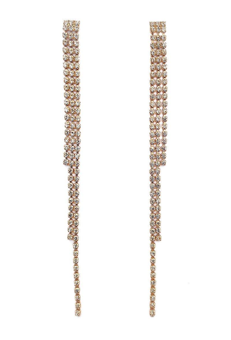 Elegant graduated rhinestone fringes. These stylish dangle earrings measure 11.5 cm in length. They are plated with genuine gold, and the ear post is made of hypoallergenic titanium.
