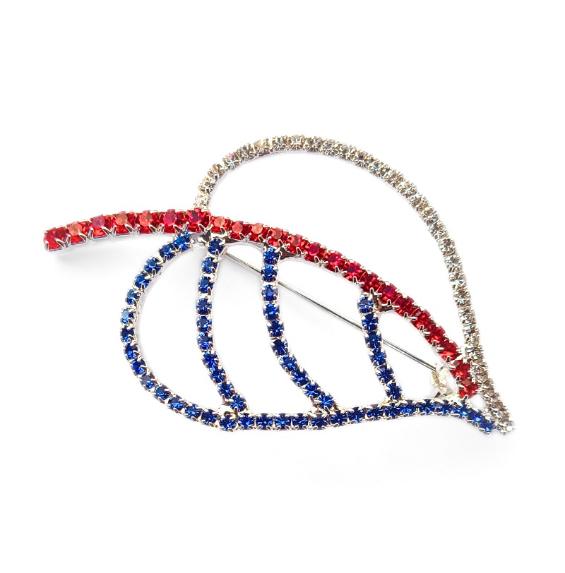 Elegant brooch in the shape of a linden leaf, adorned with sparkling crystals in tricolor. The metal parts are plated with a thin layer of genuine silver. The brooch measures 65 × 40 mm and features a classic pin closure.