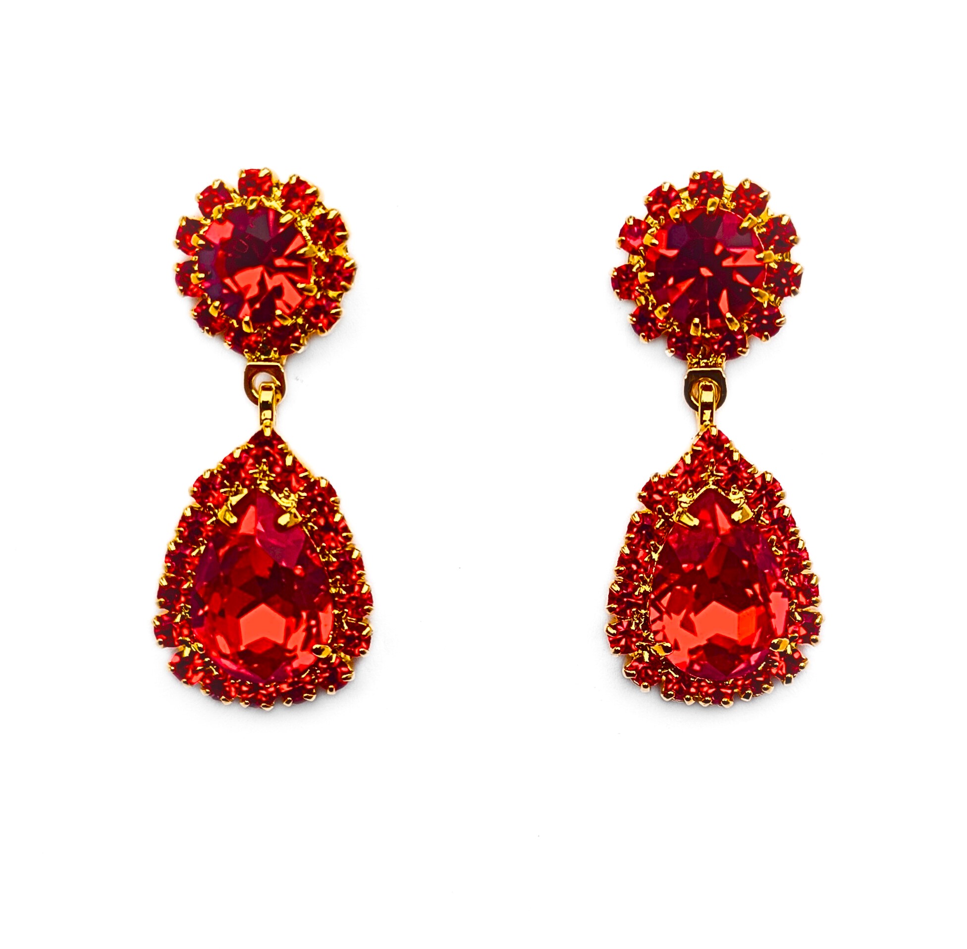 Elegant drop earrings crafted from precision machine-cut crystals in a vibrant red Light Siam shade. The precise faceting enhances their brilliance and gives the color exceptional depth and sparkle. Metal components are finished with a delicate layer of genuine gold. The ear posts are made from hypoallergenic titanium, making them suitable even for sensitive ears. Total length: 35 mm.