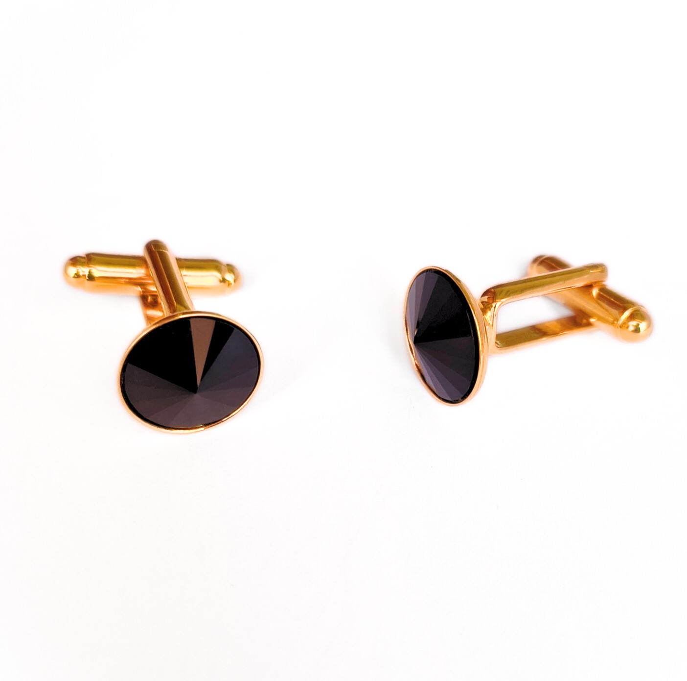 Cufflinks decorated with a black Rivoli-cut crystal. The metal parts are plated with a thin layer of genuine gold. The size of the crystal is 1.3 cm.