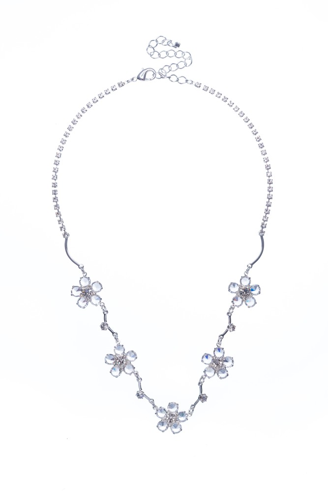 Delicate necklace made from high-quality Czech faceted stones in clear crystal color. The metal components feature silver plating. The necklace length is 38 cm plus an 8 cm extender chain. The diameter of the flower pendant is 1.5 cm.