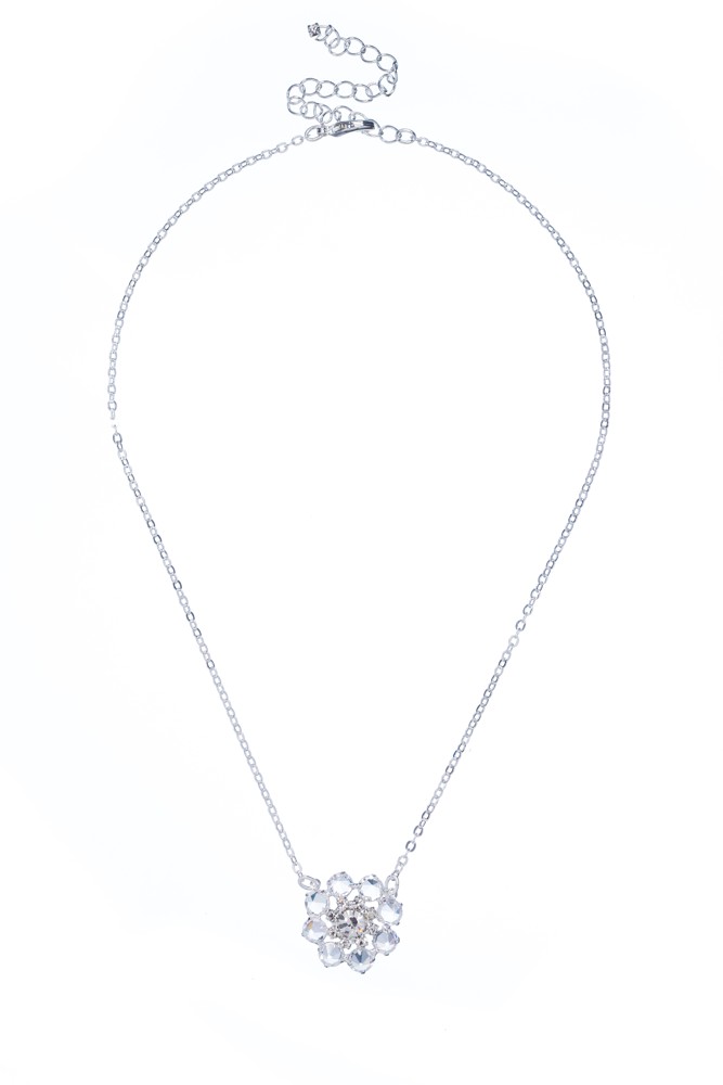 Simple necklace made from high-quality faceted stones in clear crystal color. The metal components feature silver plating. The necklace length is 38 cm plus an 8 cm extender chain. The flower has a diameter of 2 cm.