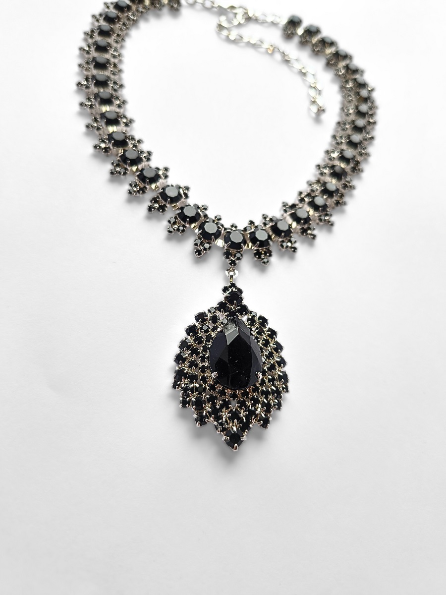 Nadčasový štrasový náhrdelník ze sytě černých broušených kamenů. Dominantním prvkem je tvarovaný kámen ve tvaru hrušky, který dodává šperku eleganci. Povrch kovodílů zdobí lesklá stříbrná galvanizace s ochrannou vrstvou pro delší živosnost. Délka náhrdelníku 30 cm s možností prodloužení o dalších 10 cm. Velikost centrálního motivu cca 3 × 3,5 cm.