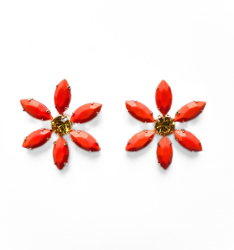 Náušnice ve tvaru květu jsou tvořeny ručně vyráběnými navetami v sytě oranžovém odstínu a doplněny zářivým žlutým citrínovým krystalem uprostřed, tzv. šatonem. Průměr květu je přibližně 4 cm. Všechny kovové části jsou pokoveny pravým stříbrem a opatřeny ochrannou vrstvou pro delší životnost. Dřík do ucha je vyroben z hypoalergenního titanu.