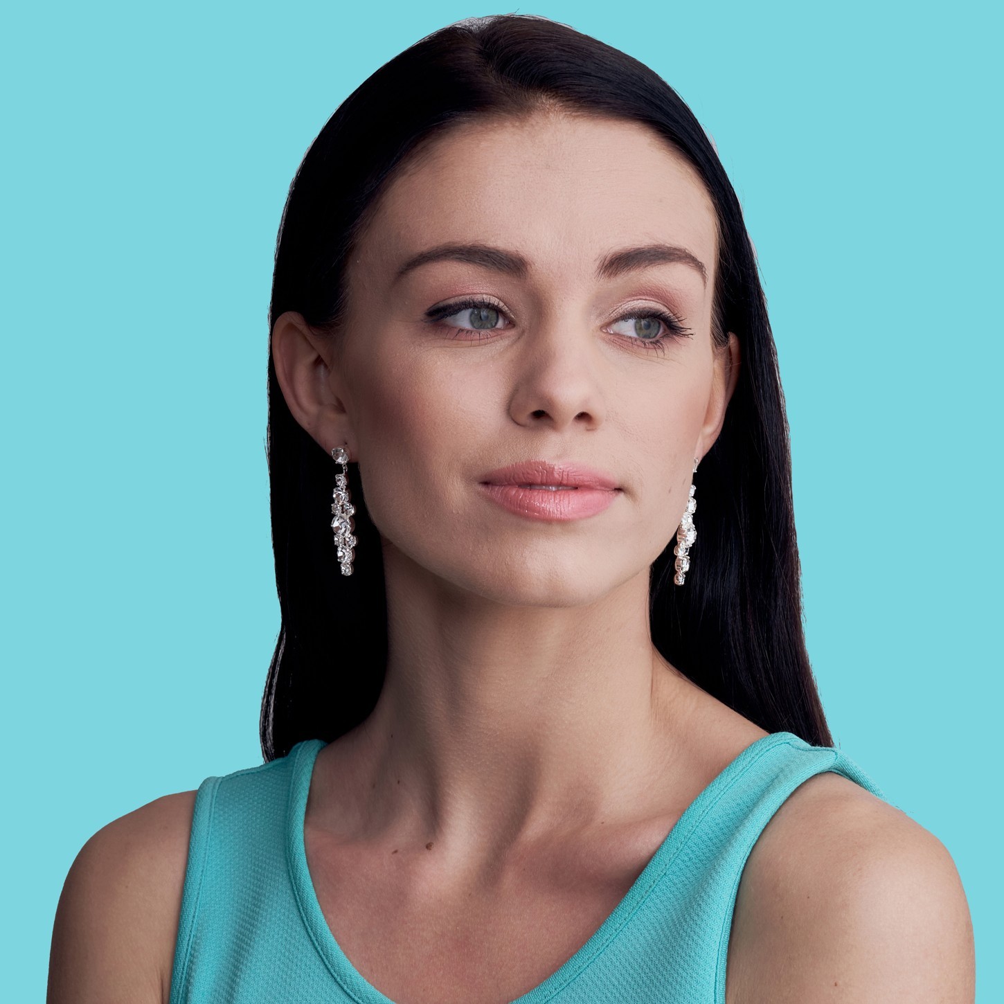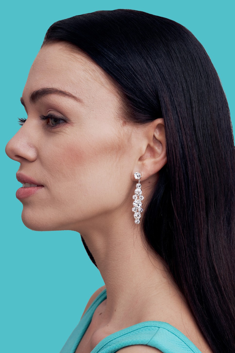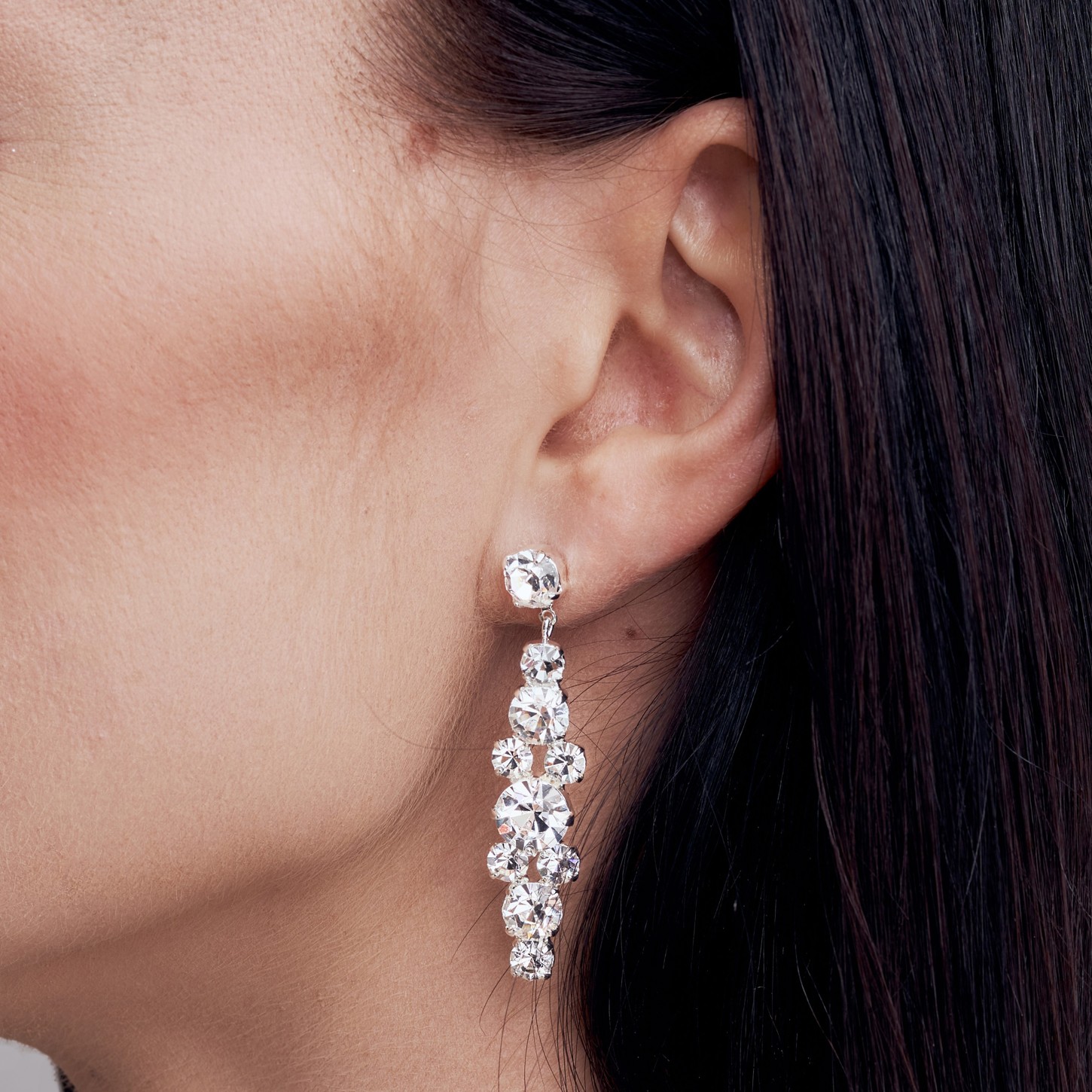 Tradiční štrasové visací náušnice ze strojně broušených krystalů tzv. šatonů. Středem hlavního motivu je kulatý šaton průměru 6 mm. Náušnice mají celkovou délku 48 mm. Kovodíly jsou zdobeny pravým stříbrem s ochranou proti černání. Dřík do ucha je vyroben z chirurgické oceli.